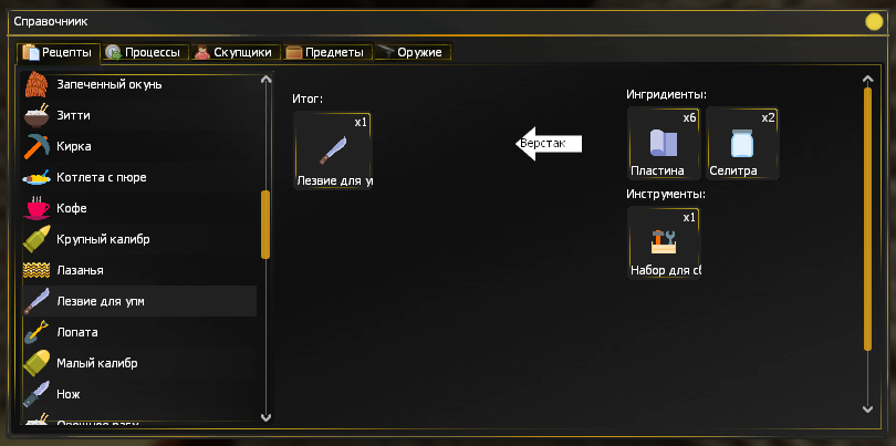 Списки всех рецептов и процессов, а также имеющихся стандартных предметов и оружия можно найти в справочнике через F4 - Справочник